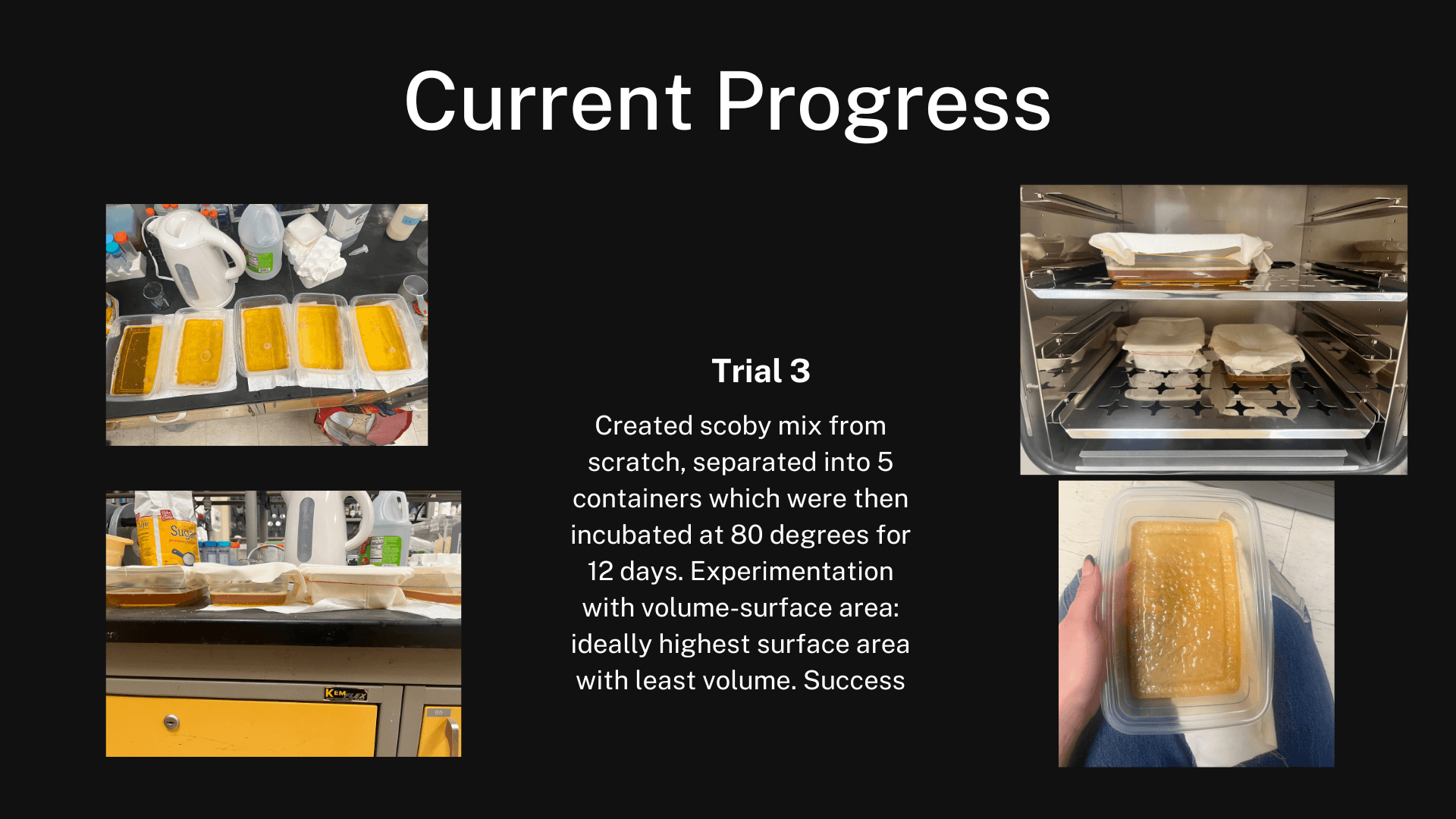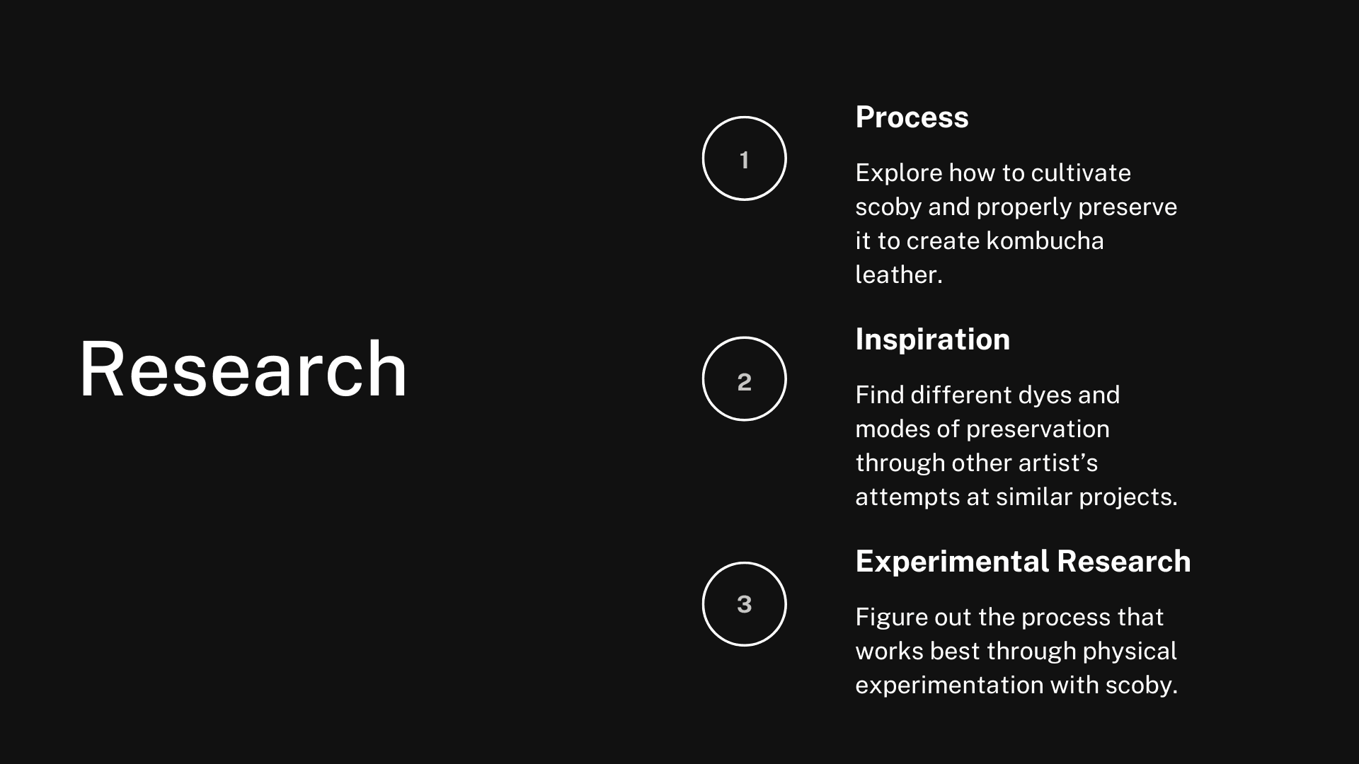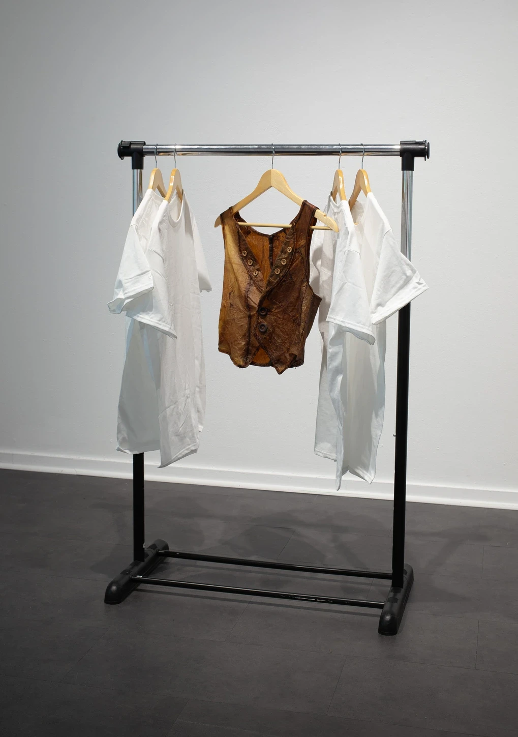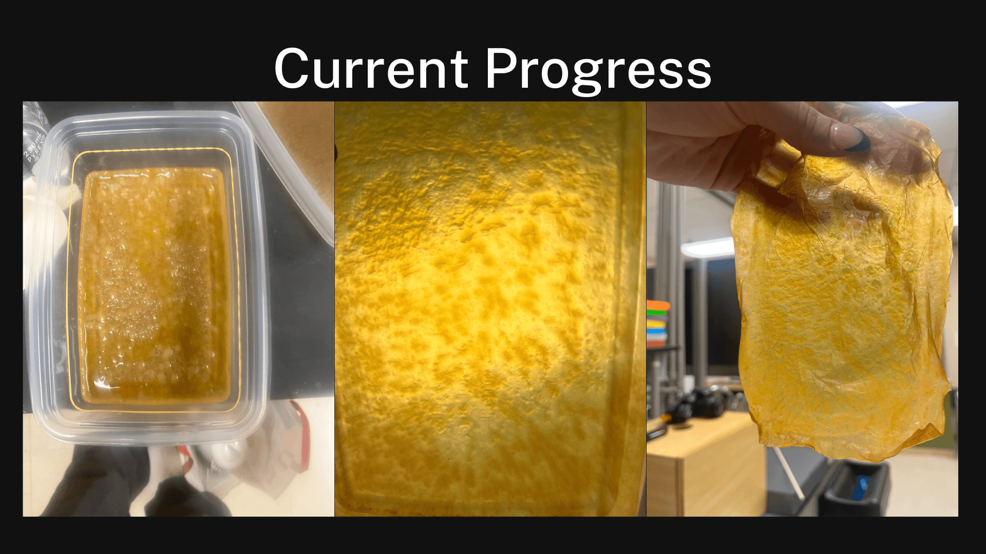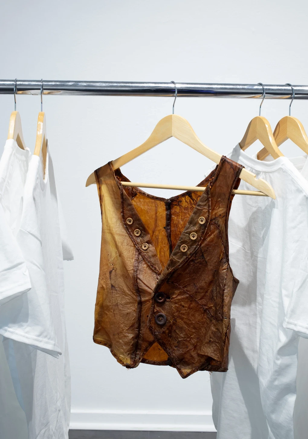 I chose a vest to showcase the fabric as it is a commonly recognizable object. In addition, vests are unique in that they are a wardrobe staple that outlasts trends. When dried, scoby resembles a leather-like texture. When properly preserved, scoby can last years. When disposed of, the bacterial cultures in the textile degrade quickly and benefit the ecosystem. My final work display will also include a short video displaying the vest being styled and worn in public to contextualize its function. This video will be projected on the wall behind a clothing rack containing the scoby vest.