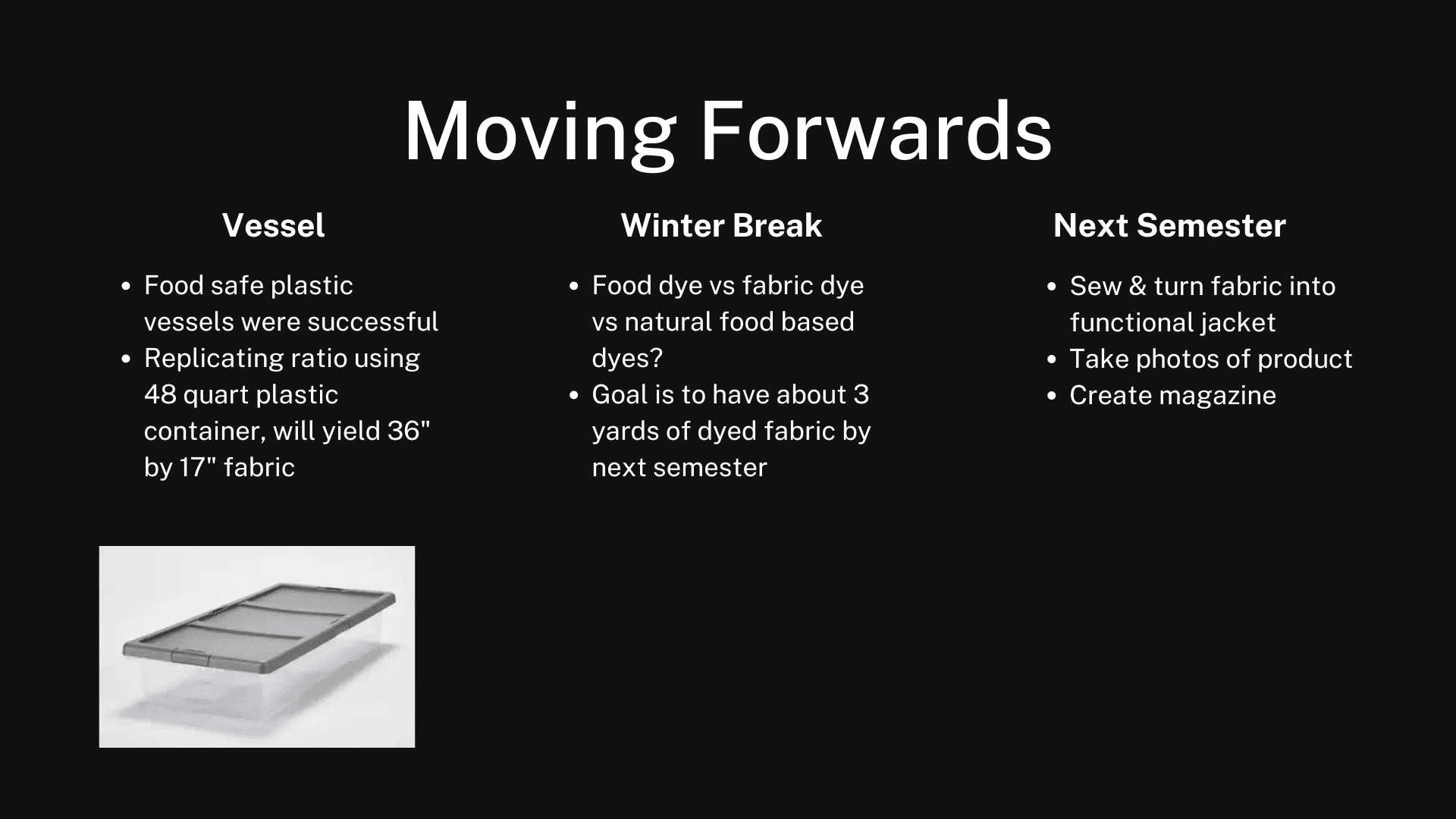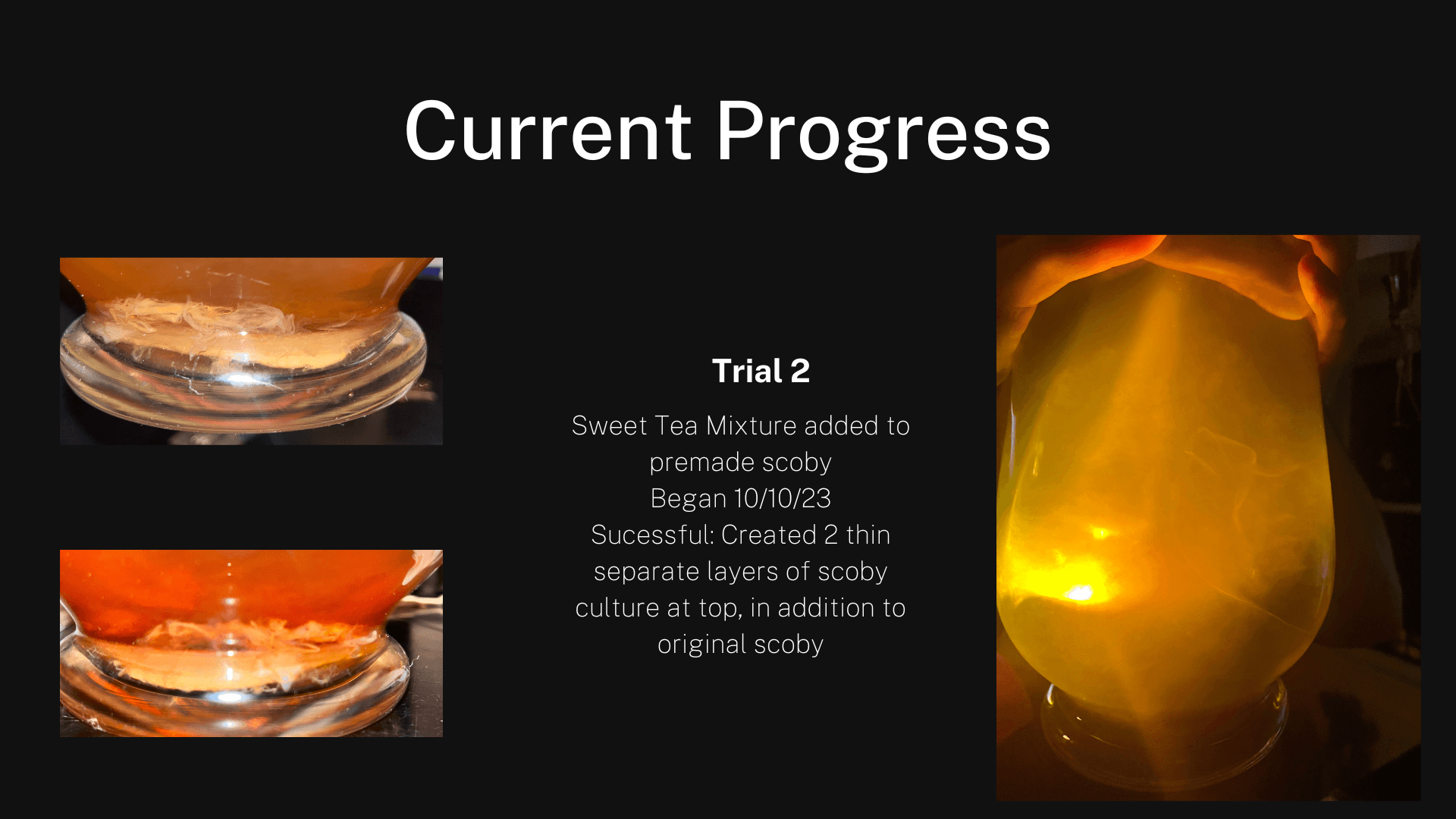 My goal is to create a clothing item that the audience would not discern as any different from a typical vest until closer inspection. I want to show that bacterial cellulose can be an excellent substitute to modern fabric and should be utilized as such. Few people are aware of the process and qualities behind kombucha. I intend to educate my audience about the incredible uses of scoby and incite an inward look at their own fashion consumption practices.