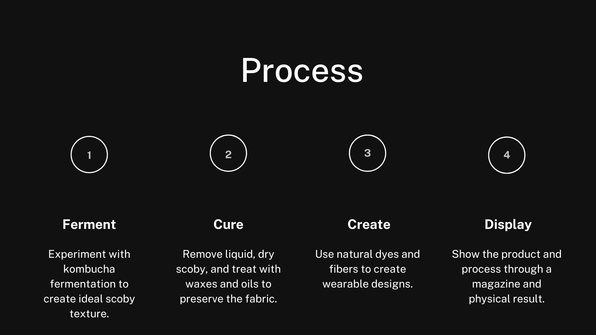 My final piece will highlight a unisex classic style vest jacket created from a biologically synthesized fabric made from dehydrated scoby. Scoby (symbiotic culture of bacteria and yeast) is a living bacterial colony that is mainly used to ferment tea into the popular drink kombucha. My goal with this work is to create a conversation around aggressive waste in the fashion industry and demonstrate alternative textile options to commonly used non-biodegradable fabrics.