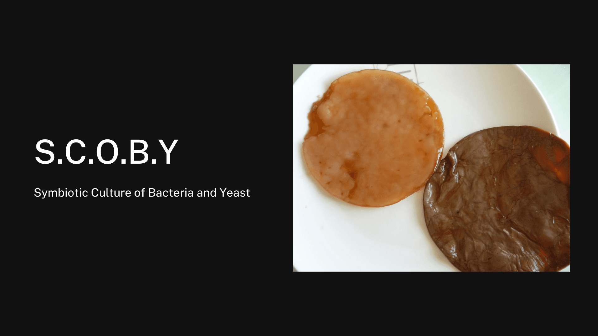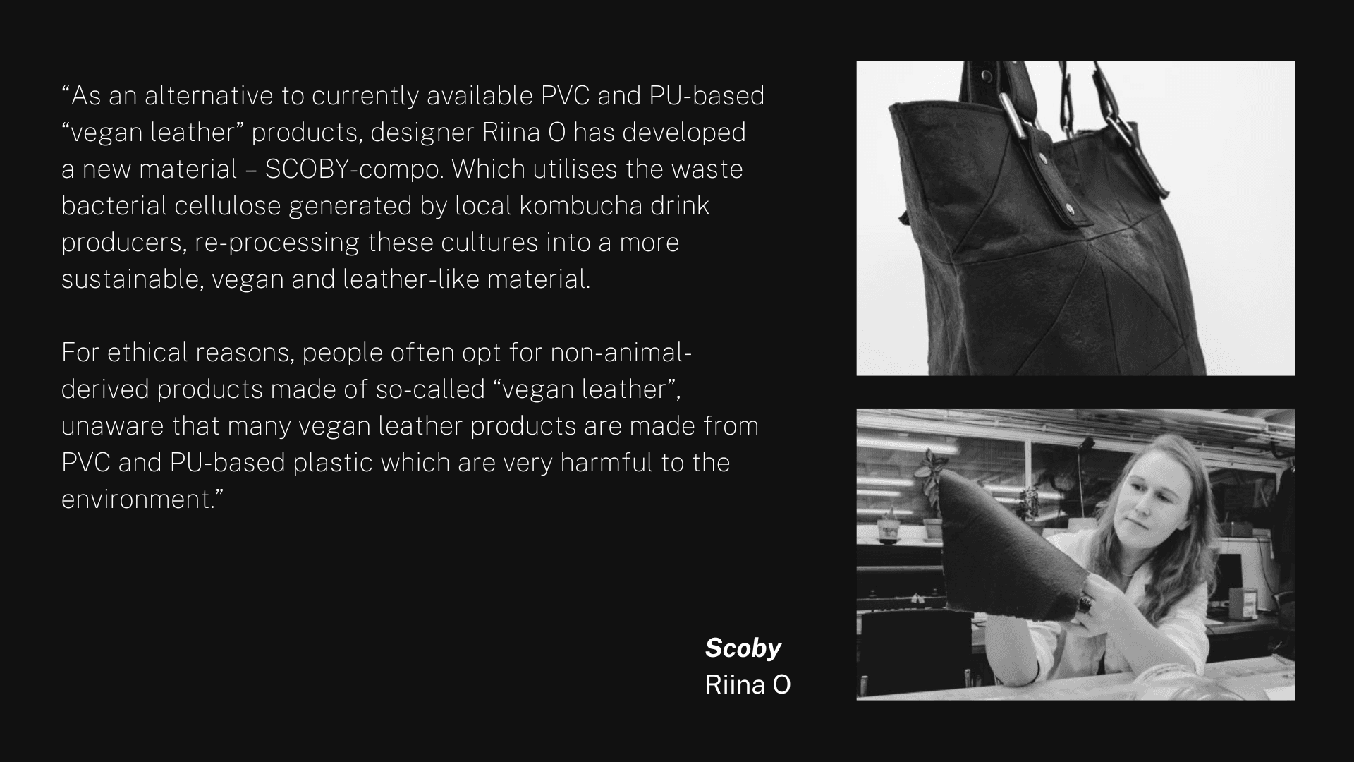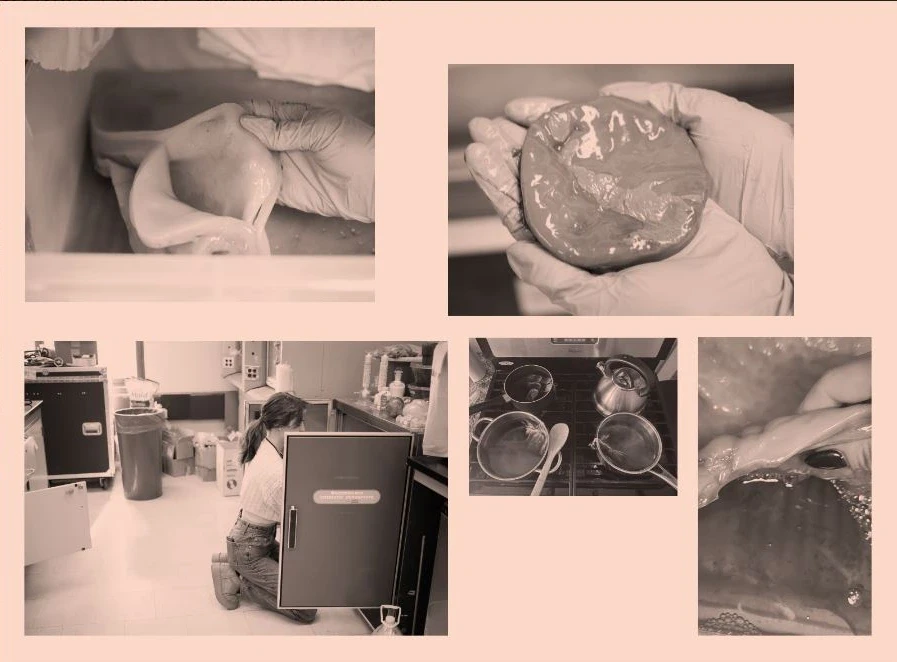 GROWING THE TEXTILE: The material was produced through kombucha fermentation using sweetened tea and a SCOBY culture. During fermentation, bacteria generate a cellulose biofilm that forms a thick layer on the surface of the liquid. This bacterial cellulose was harvested and dried to transform the gelatinous film into a flexible leather-like textile.
