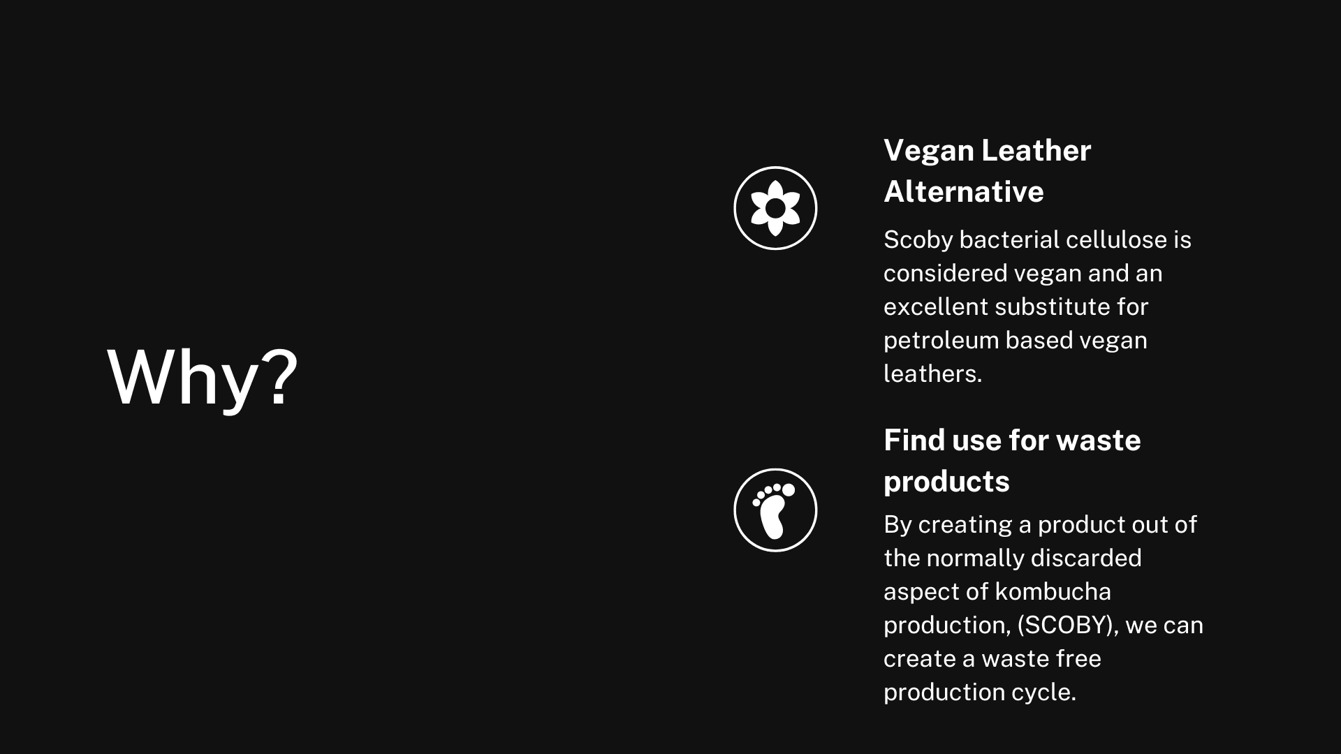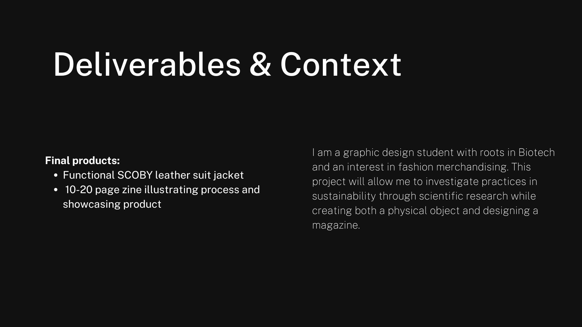 This work investigates sustainable practices amidst a trend-cycle fueled fashion culture. Our society has become consumerist in nature, and fashion trends are a large contributor to the ever-growing textile waste epidemic. My intentions with this work are to demonstrate how it is both possible and accessible to create wearable biodegradable fashion. Through the processes of fermentation and dehydration, I created a leather-like textile of bacterial cellulose known as SCOBY. Commonly used in creating kombucha drinks, scoby is a living bacterial culture that serves many purposes. By fermenting black tea, sugar, and scoby bacterial cultures, I was able to create a usable textile that is both functional and beneficial to the soil upon disposal. The vest consists solely of scoby fabric and cotton thread, sewn through traditional mediums. I want to show how this unconventional medium can be used as a substitute for common textiles such as nylon, polyester, and cotton, which take years to degrade and have a harmful ecological impact. The projected film is intended to contextualize the jacket’s function as equivalent to any other leather jacket. Scoby leather is a revolutionary medium that is simple to create and is functional like a typical fabric. This vest proves that it is possible to escape the single-use fashion cycle and limit our textile waste.