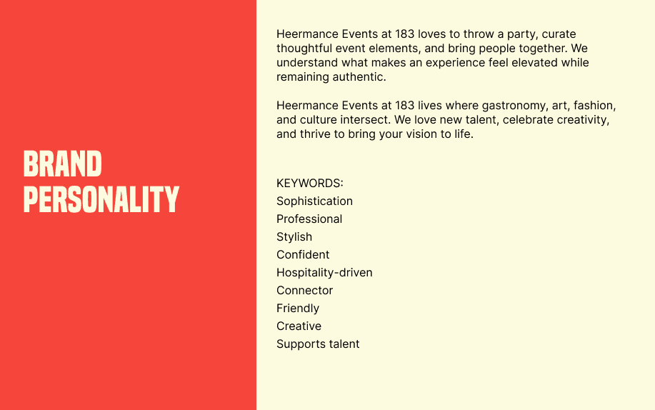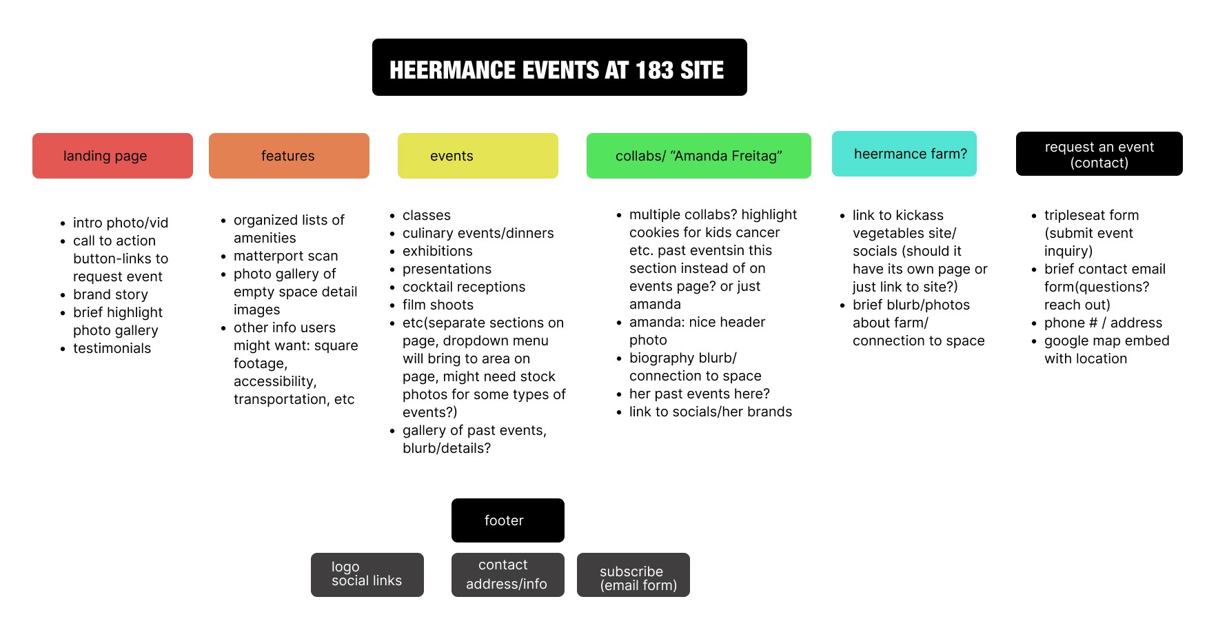 The final website serves as both a visual introduction to Heermance Events at 183 and a practical tool for event inquiries. By combining clear information architecture with an image-driven design approach, the site communicates the venue’s identity while supporting its role as a space for gatherings, culinary collaborations, and cultural programming.