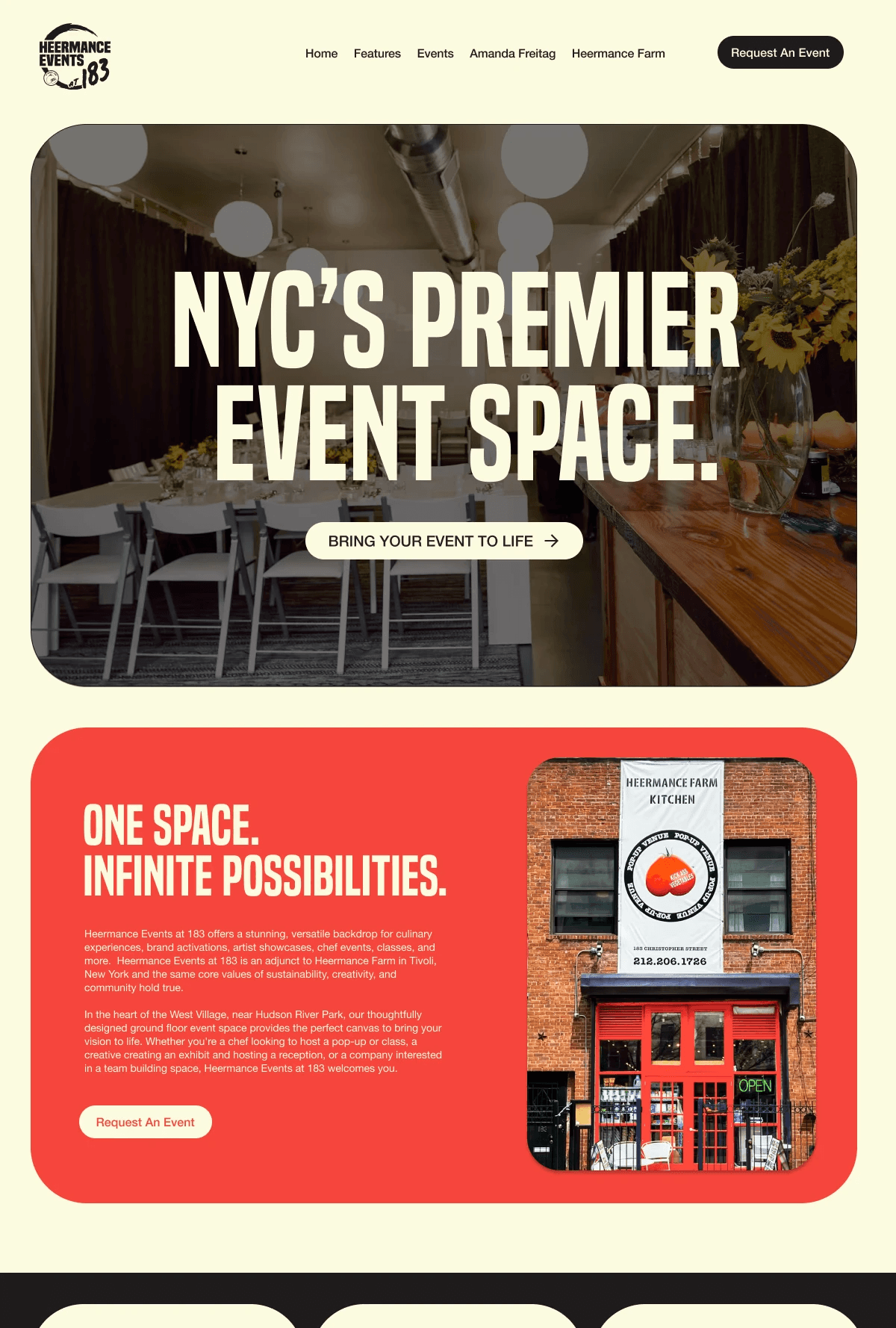 I was challenged to create a website to showcase a new rentable event space, Heermance Events at 183, owned by the company. As the event space marketing was primarily culinary focused, I partnered with the space's representative, Chef Amanda Freitag, to develop a comprehensive visual identity for the space. The project involved integrating and customizing a booking form from Triple Seat event management software, as well as a logo developed by another designer. The site includes a gallery of edited photos of previous events. Developed in Framer. Wireframed in Figma. Utilized Javascript, CSS, and HTML for custom coded elements.