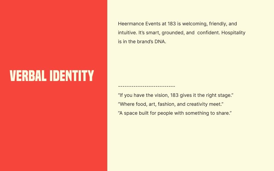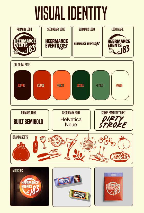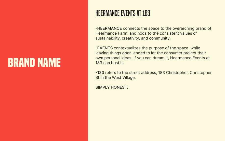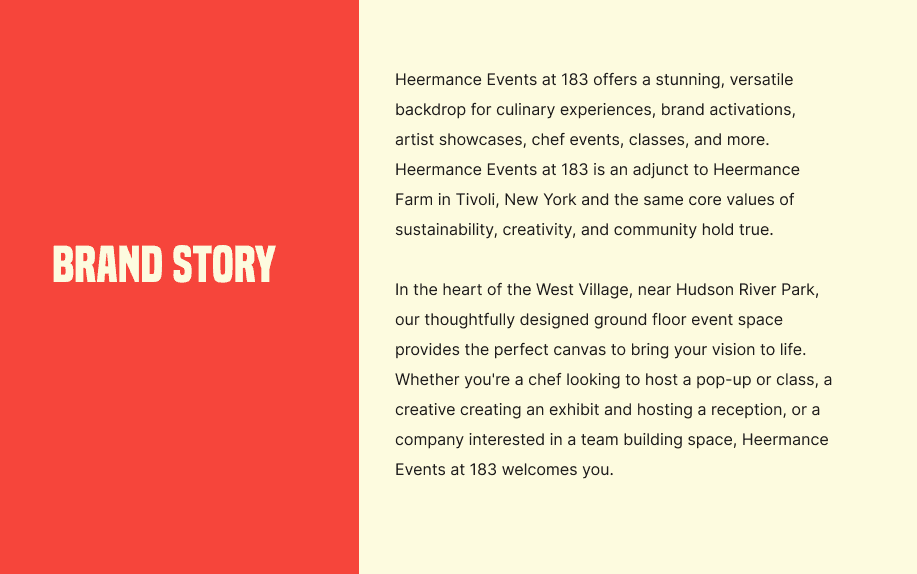 Heermance Events at 183 is a West Village event space created by Heermance Farm, designed to host intimate gatherings, culinary collaborations, cultural programming, and private events. The website was developed as the primary digital presence for the venue—communicating the atmosphere of the space while providing essential information for potential clients, collaborators, and event organizers. My role involved designing the structure and visual direction of the site, beginning with wireframes in Figma to establish user flow and page hierarchy before translating those designs into a fully built website.